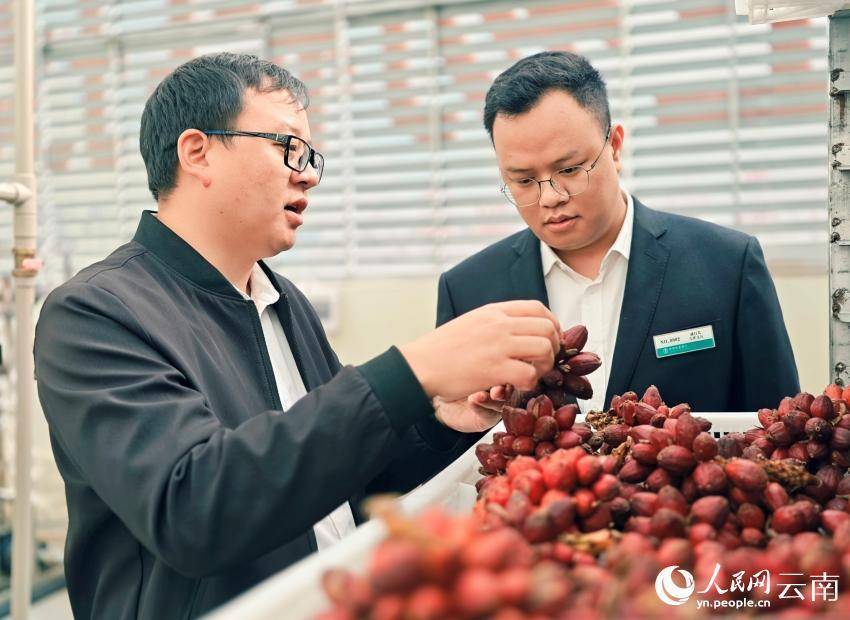 高新技术企业负责人向农行客户经理介绍草果。人民网 尹馨摄