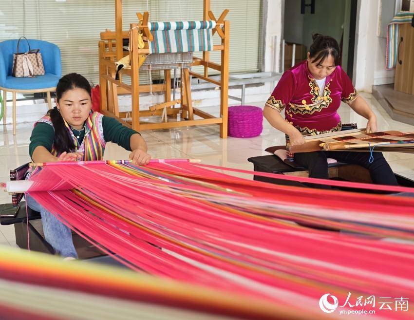 “织女”们在织独龙毯。人民网 尹馨摄
